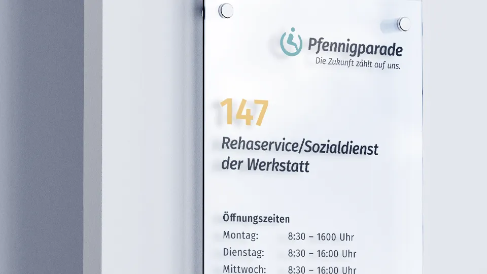 Da die Pfennigparade Menschen mit Körperbehinderung und anderen Beeinträchtigungen in allen Lebensphasen begleitet, war es eine Vorgabe, für das Signet den bewährten „Pfennigparade-Rollstuhl“ beizubehalten. Signet und Wortmarke wurden daher sehr behutsam optimiert.